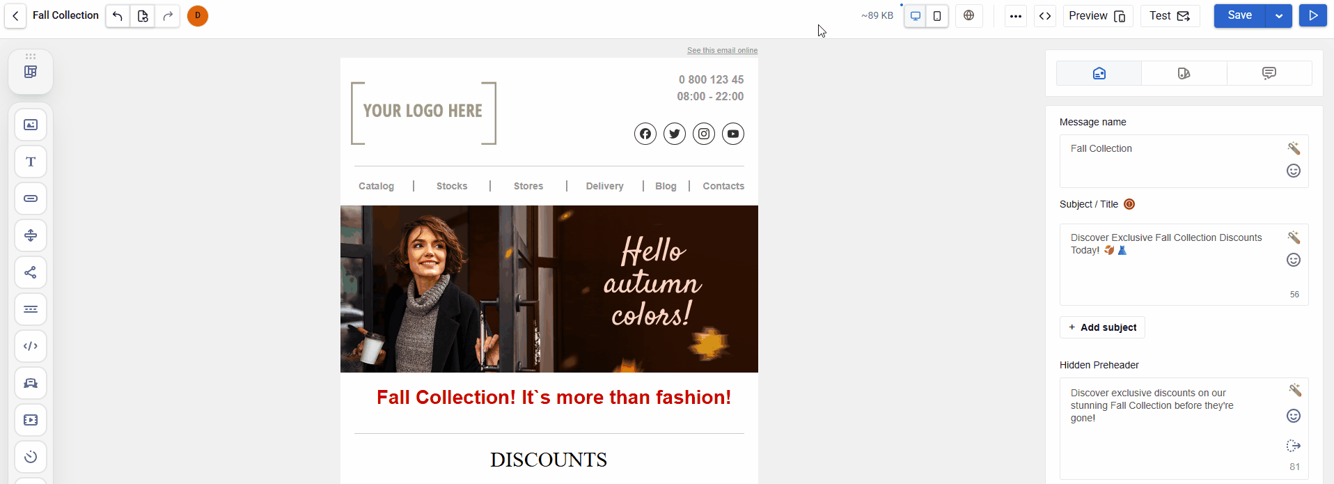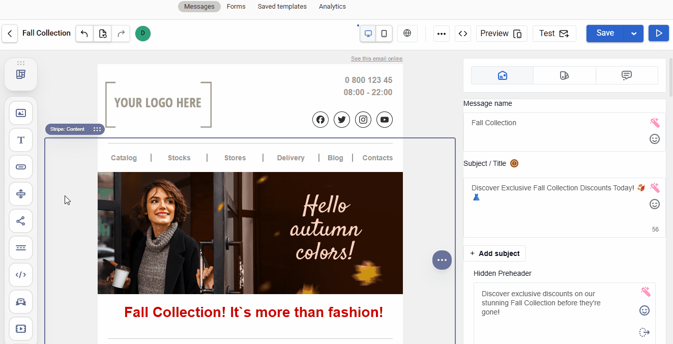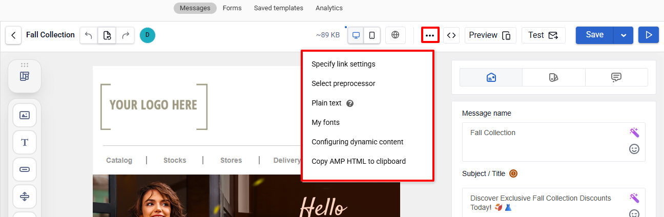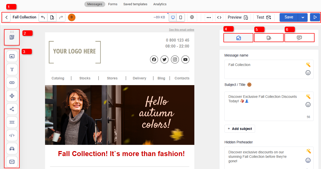 - Message settings ā set core parameters, including subject, hidden preheader, and sender name.