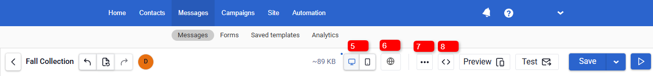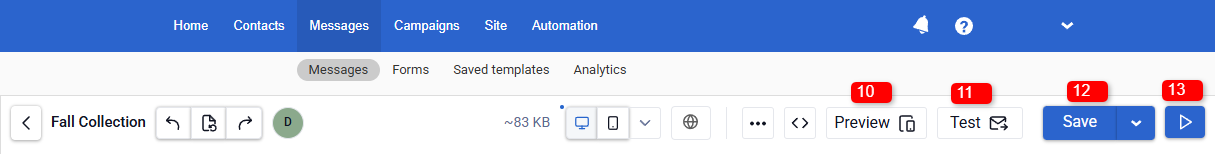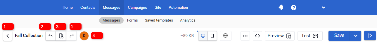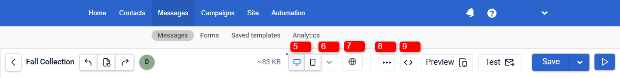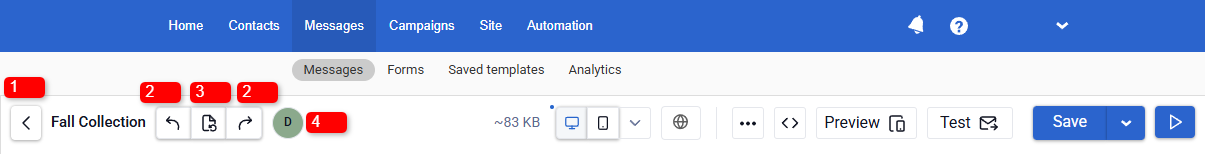 - Email size indicator. Next to the version controls, the current email size (KB) is displayed.