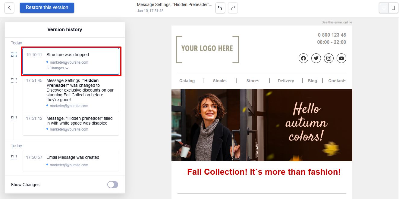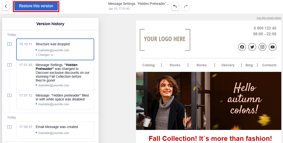 Click the Restore this version button at the top of the screen to revert the email to the state it had when the selected version was saved.