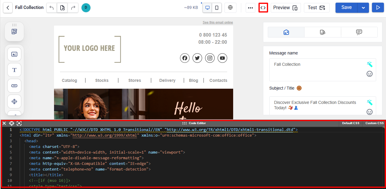 - Code editor ā switch to manual HTML editing for direct code changes.