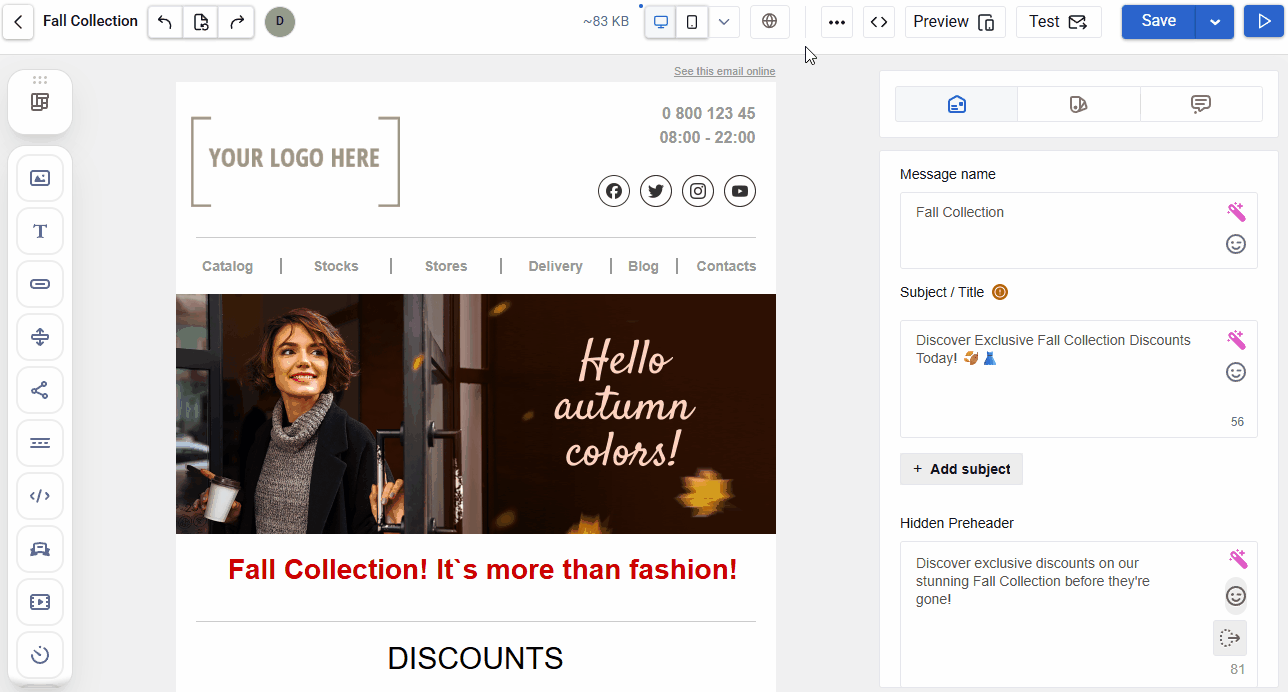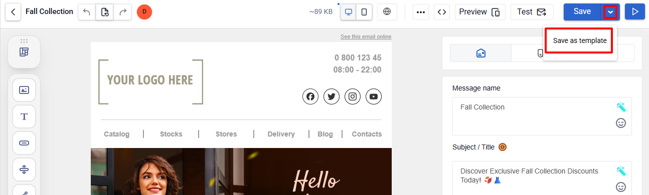 - Email preview ā view the email as recipients will see it, without editor elements.