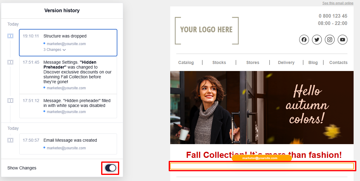 The Show Changes toggle enables visual highlighting of changes in the email.