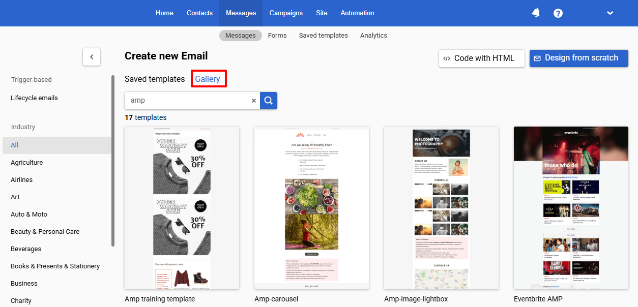 In addition to individual blocks, you can also use ready-made AMP templates from the library in your account.