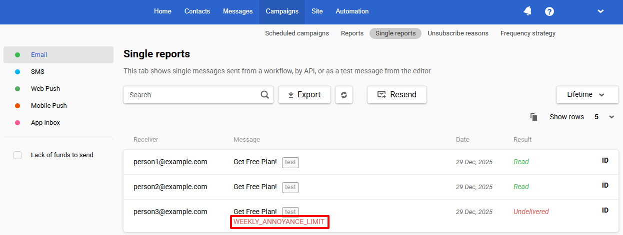When the weekly limit is exceeded, Yespo stops sending messages to this contact. In reports, such messages are marked with a non-delivery reason.