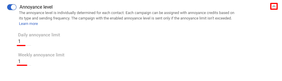 Annoyance Level limits the number of Email and Mobile Push messages a contact receives per day or per week.