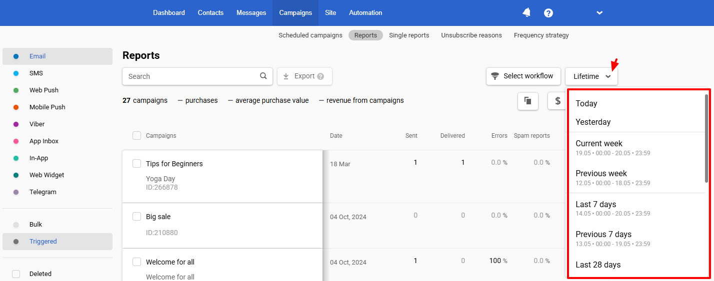 Reports are displayed as a list and automatically sorted by the start date of the campaigns ā the newest ones appear at the top. If needed, you can set a custom period or use one of the preset intervals.