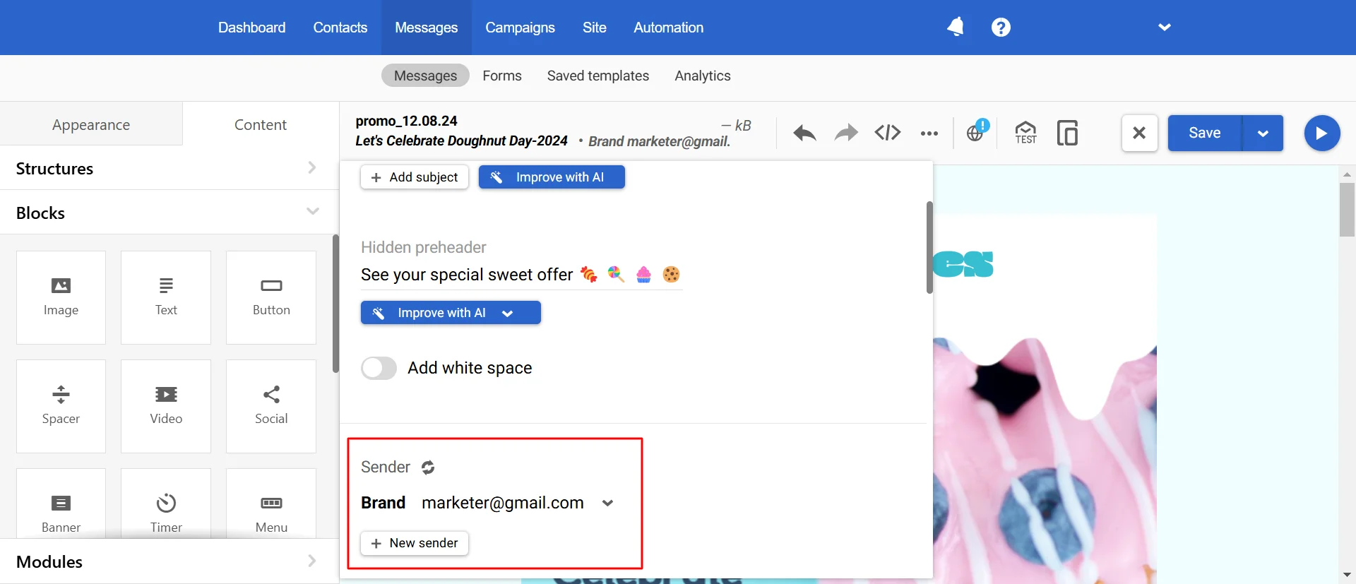NoteYou can use AI to optimize your email's subject line, preheader, and body. Click the Improve with AI button and choose the best option.
