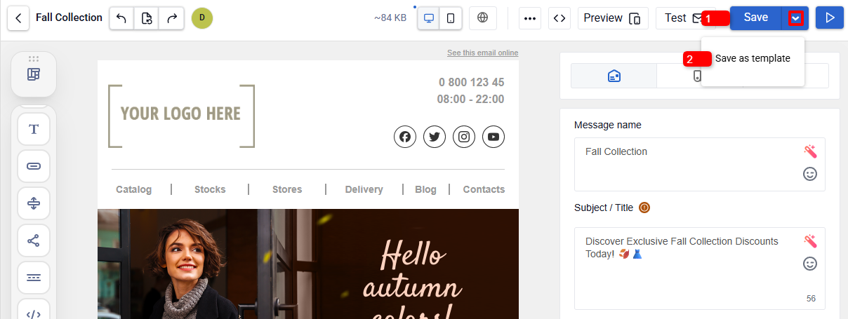 - Select Save as template if you want to reuse the message in future campaigns. The template appears on the Saved tab.