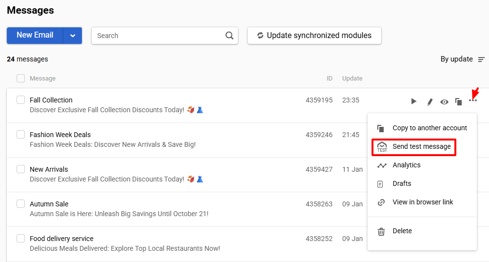 - From the message list, open the three-dot menu and select Send test message.