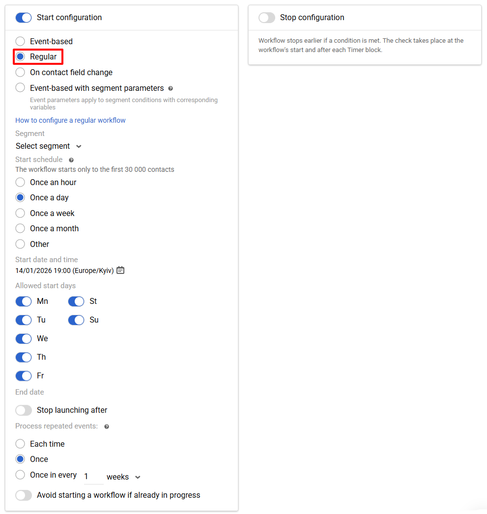 The set values of date and time in the start configuration mean that the campaign will launch when the specified time and date occur. For example, if you set the start time from 09:00 to 10:00 once a day, it means that the workflow will automatically run within the specified time each day.