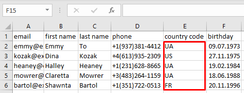 If you import a file that contains country data, the values must be provided in the ISO 3166-1 alpha-2 format (for example, UA, DE, FR).