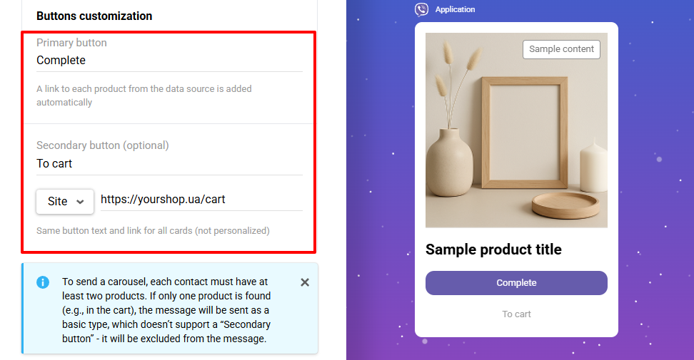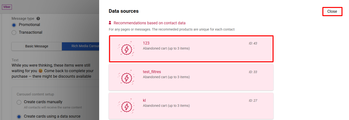 ImportantTo send a Rich Media Carousel, each contact must have at least two products in their recommendations. If only one product is found (for example, the user left a single item in the cart), a basic message will be sent.