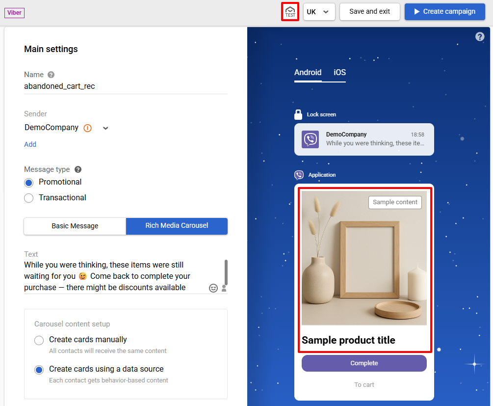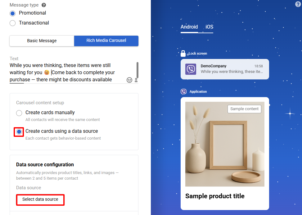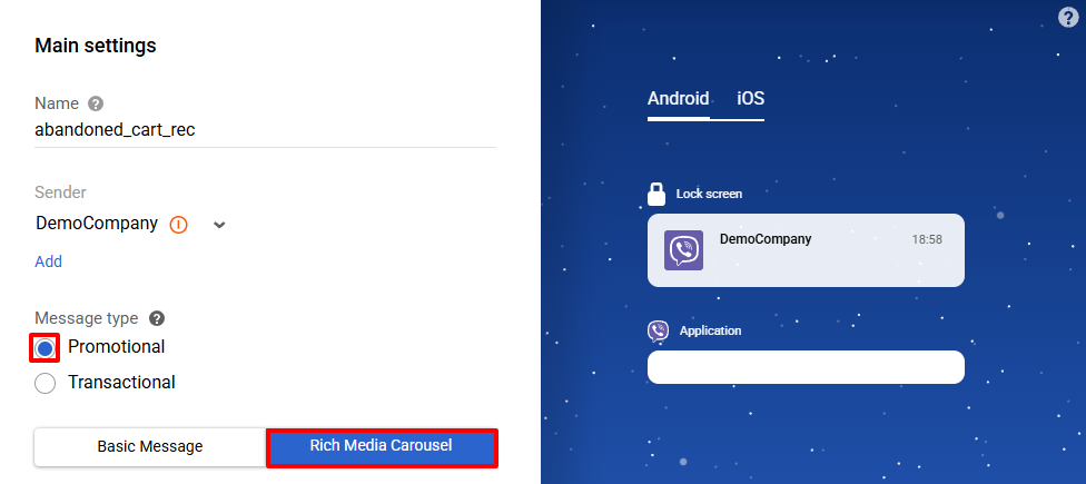 - In the Message type field, select Promotional → Rich Media Carousel.