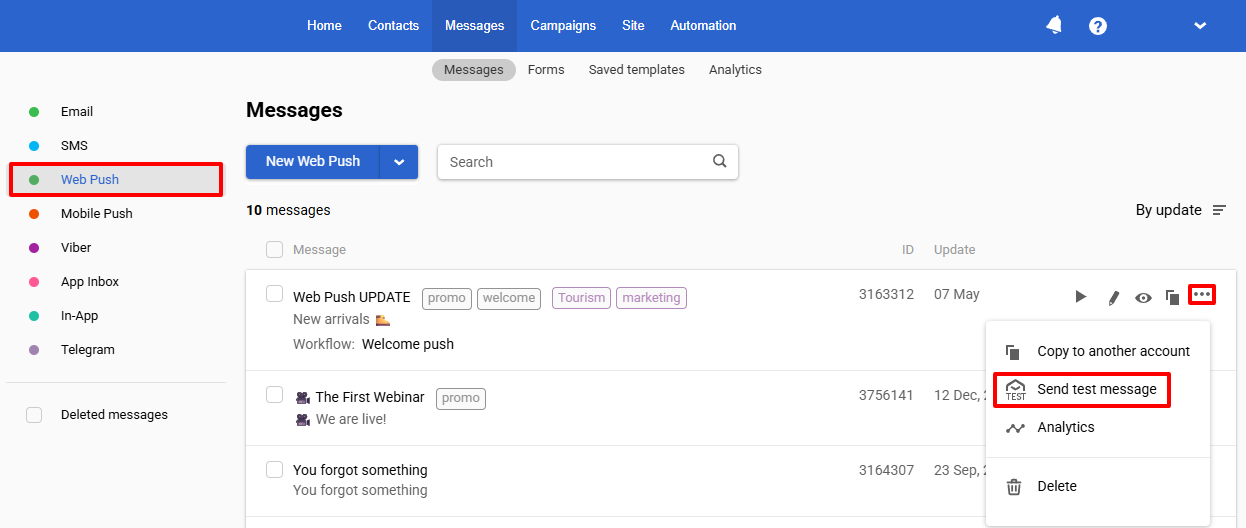 - From the message list — open the menu with three dots to the right of the message name and select Send test message.