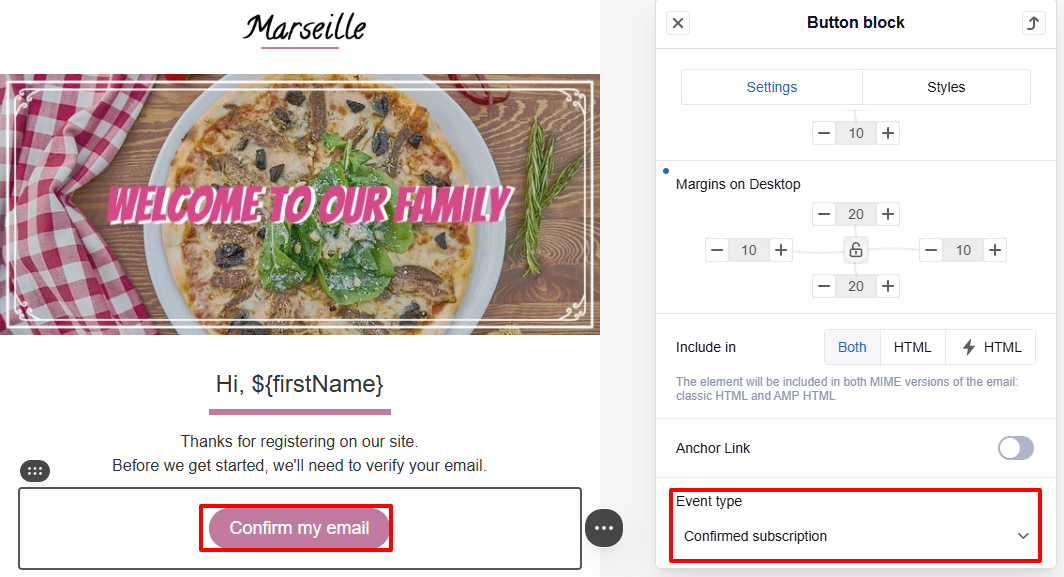 The subscriber confirms their address by clicking the corresponding button in the confirmation email. This button is assigned to the Confirmed subscription event type.