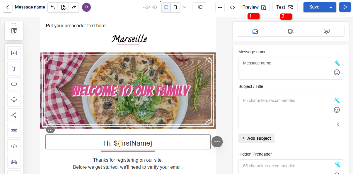 - To preview ready emails on desktop and mobile, click Preview (1). To send test emails, click Test (2).