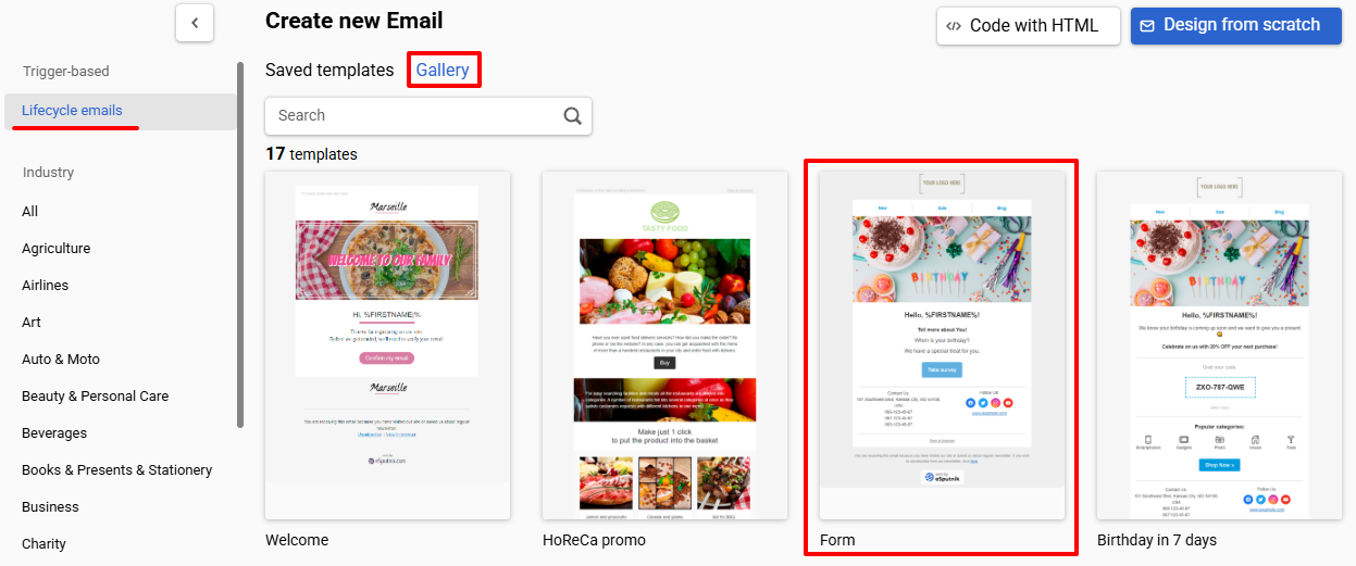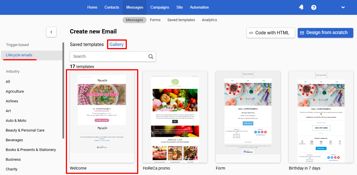 In this article, we’ll create a standard series consisting of two welcome emails. Since it is preceded by a double confirmation, thanking for the subscription is recommended in the first message. A discount or promotional code can also be a good start to the conversation. In the second message, you can tell more about the company and introduce the subscriber to other communication channels (social media, push notifications, YouTube, etc.).