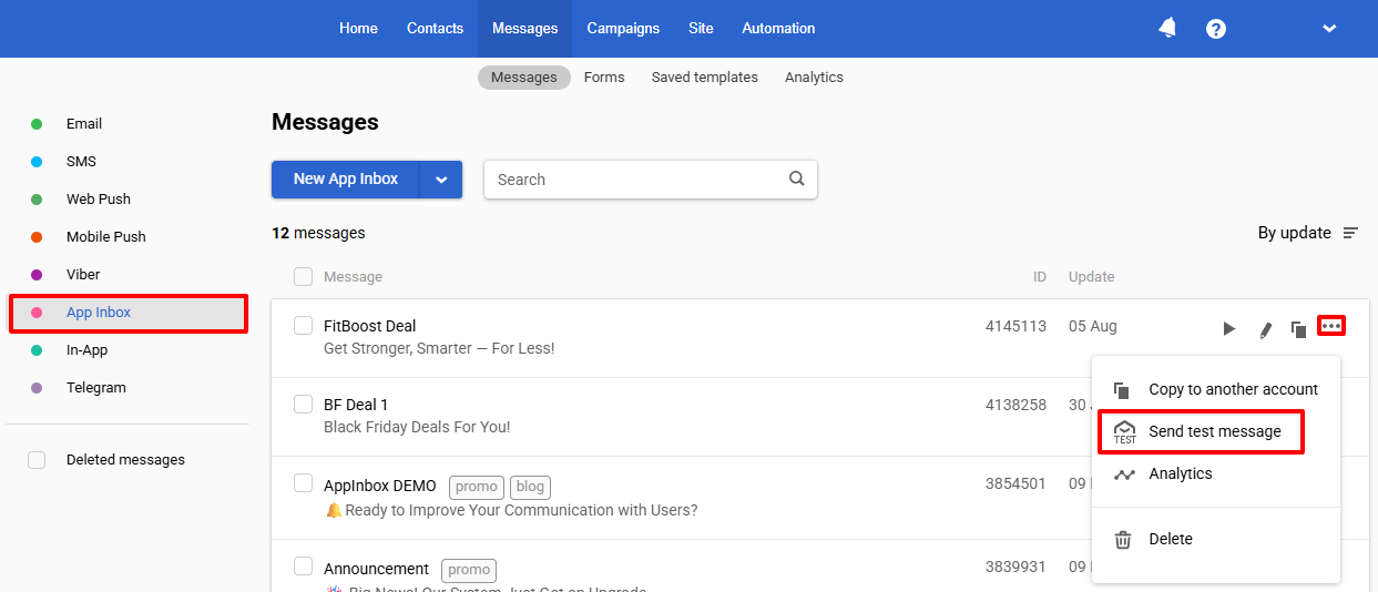 - From the message list — open the menu with three dots to the right of the message name and select Send test message.