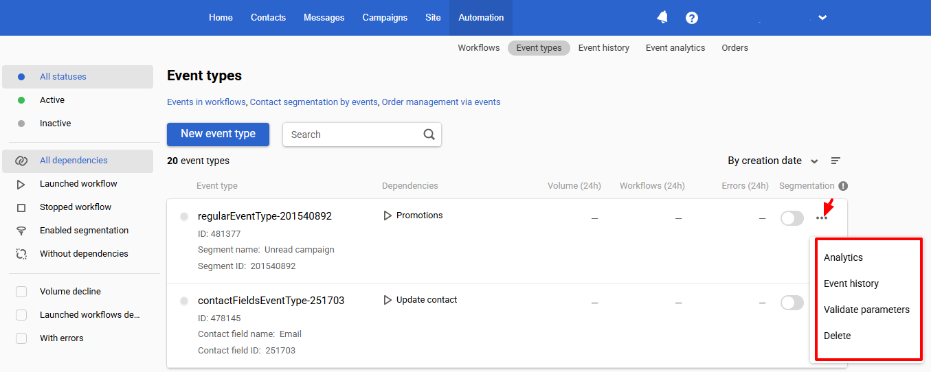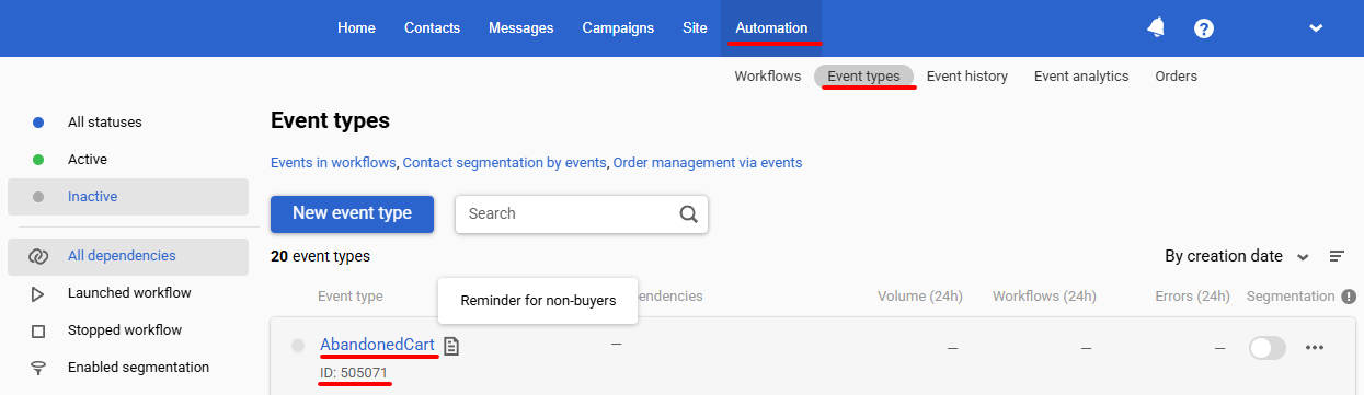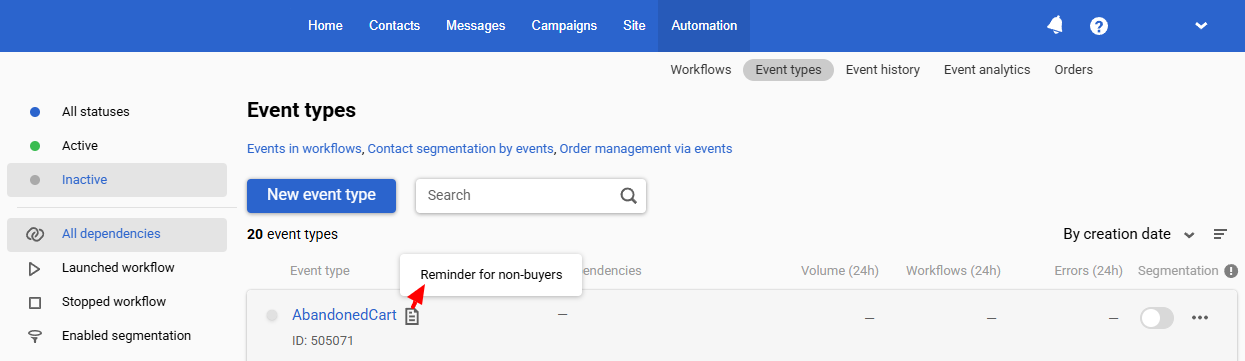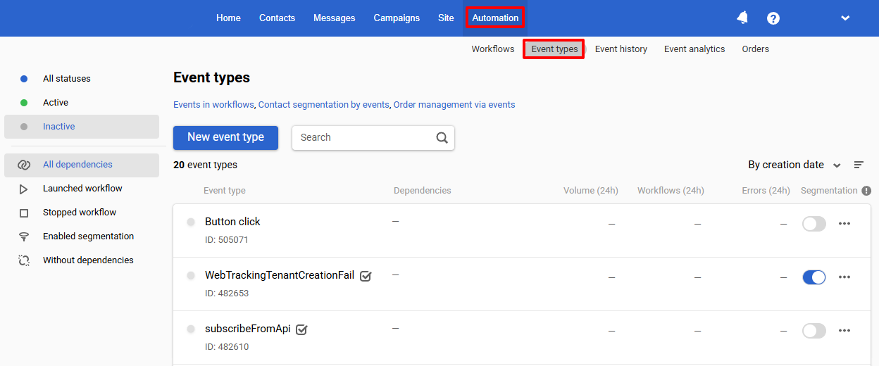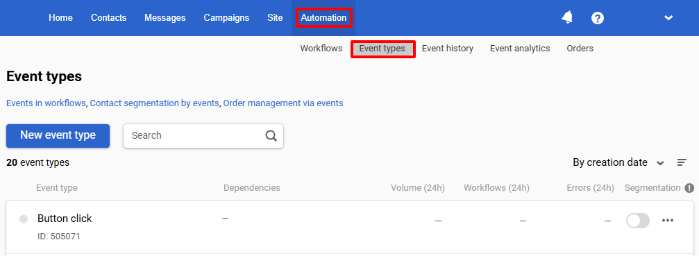 Go to Automation ā Event types to view available event types.