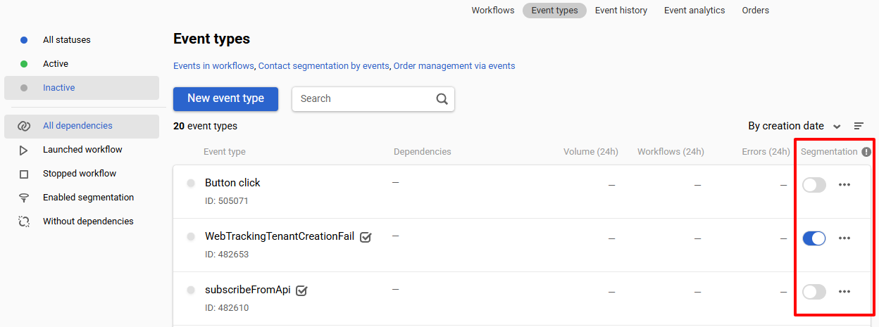 - Enabled segmentation (events are used to build a dynamic segment),