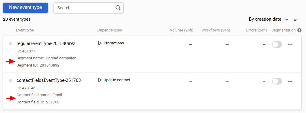 Event types created for regular workflows and workflows based on contact field changes contain: