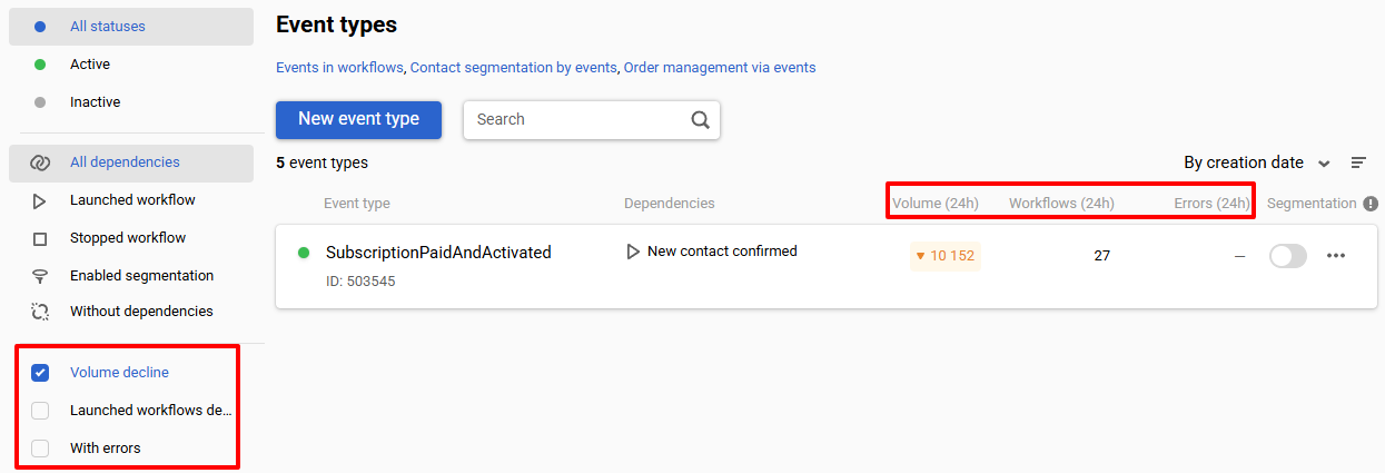 Activate the checkbox on the tab in the left menu to filter event types and workflows with declining metrics, as well as events with errors