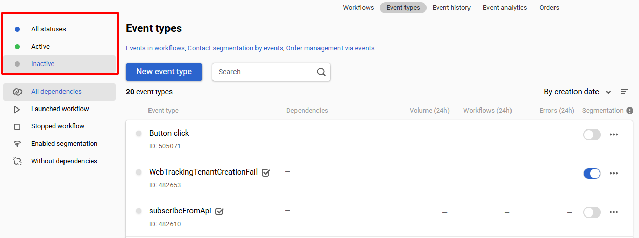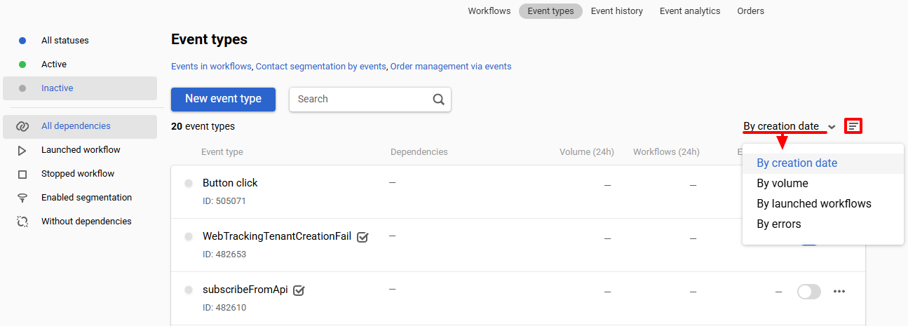 To filter event types by dependencies, select the tab: