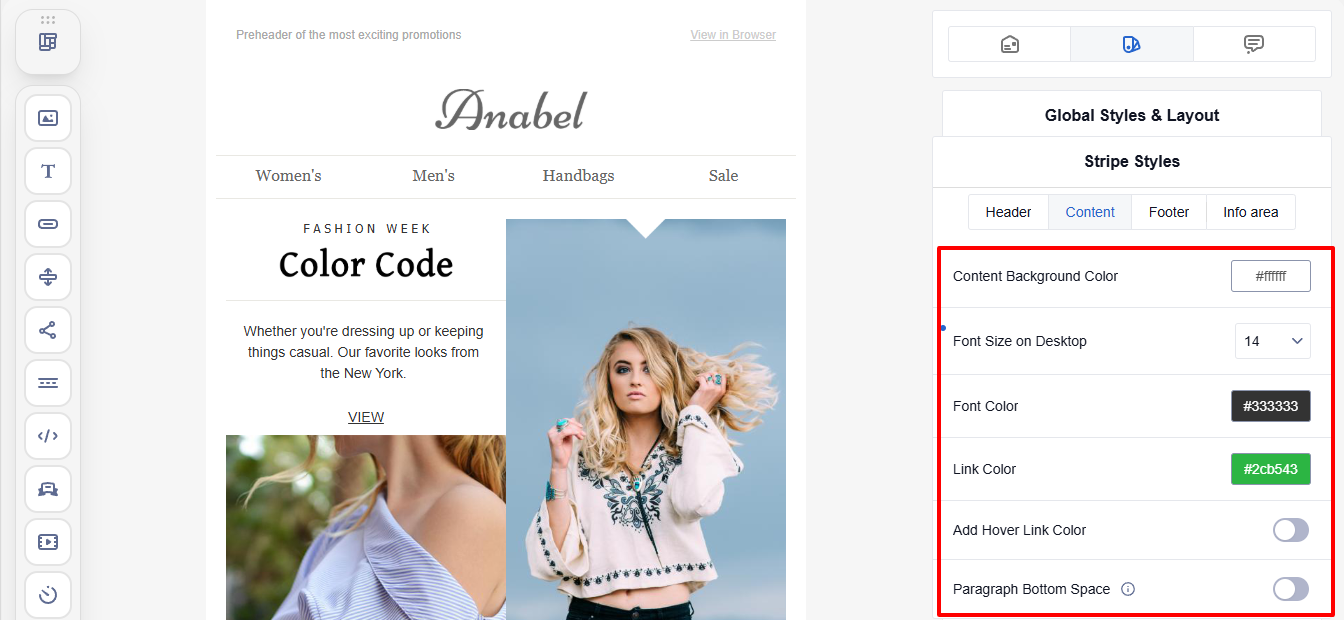 Use this tab to define the design for all parts of the email: header, content, footer, and info area.
