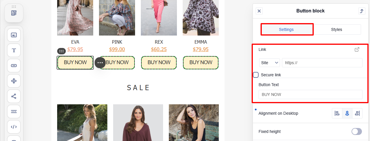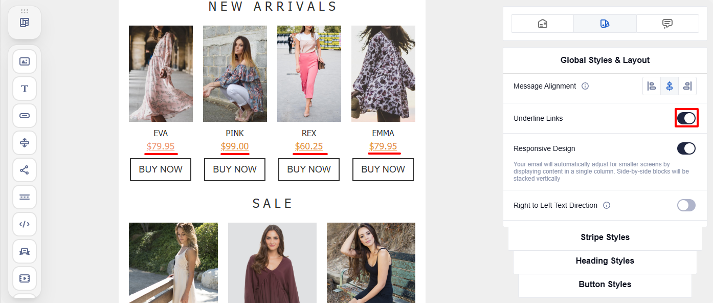 - Alignment ā the position of the email on the recipientās screen. You can align the email content to the left, center, or right.