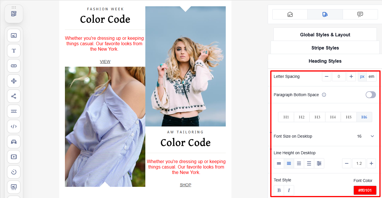 Customize the appearance of all headings in the email (H1āH6): font family, letter spacing, paragraph bottom space, font size, and line height spacing, as well as text style and font color.