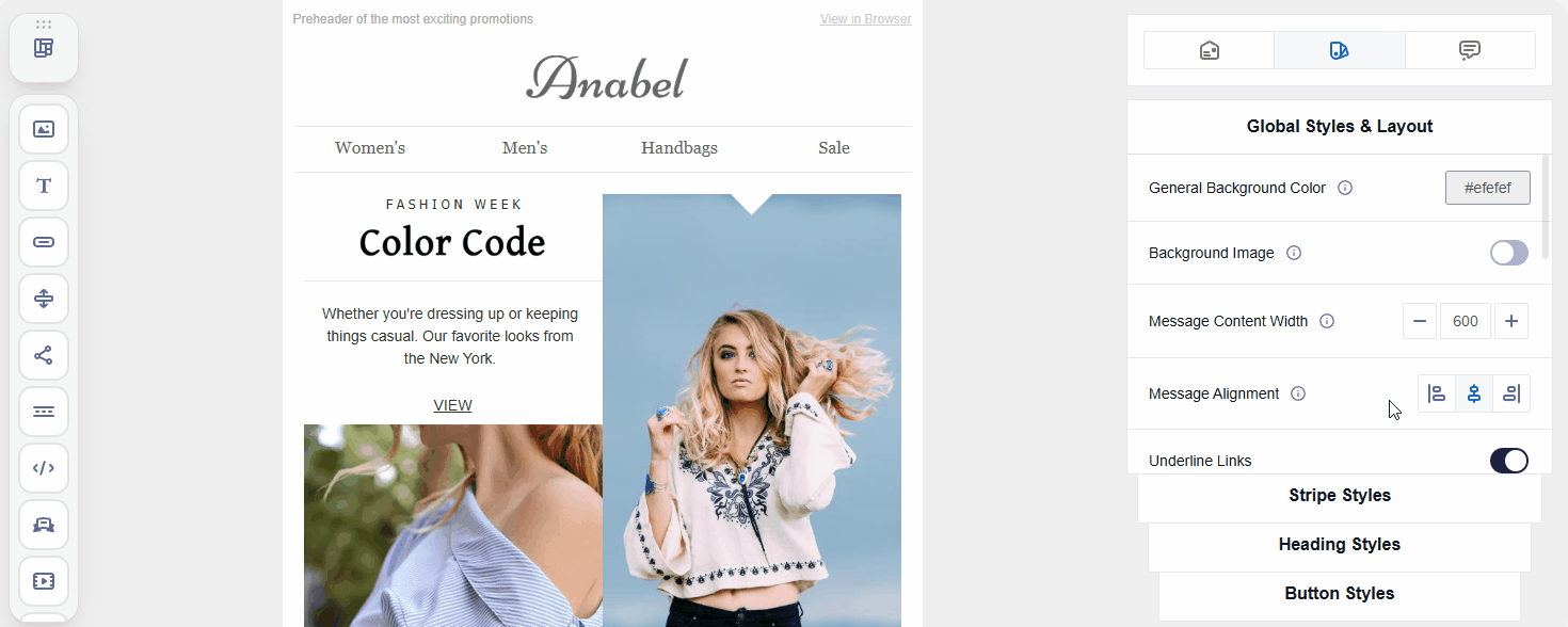ImportantWhen creating a message, you can edit any element individually ā a stripe, structure, container, or block. Custom settings on an individual element take priority over global ones and override them.