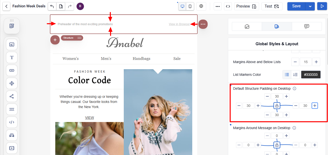 - Spacing ā lets you define the space between the email content and its edges, as well as inner spacing for structures.