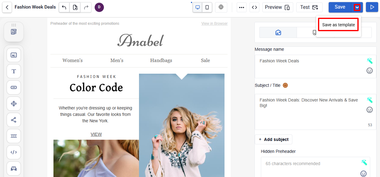 To save the email as a template, select Save ā Save as template from the menu.