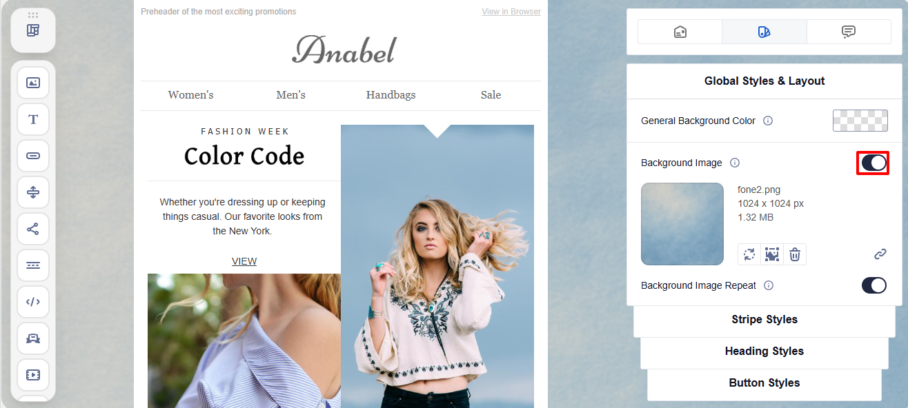 - Background color ā choose a solid background for the whole email using the color palette or a manual color code. By default, the background is transparent.