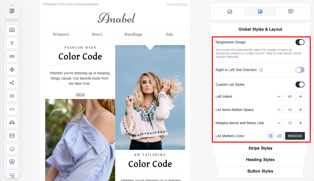 - Custom list styles ā allows you to customize the appearance of bulleted and numbered lists in the email. You can choose the color of bullets or numbers and set spacing before the list (to control the distance between preceding text and the list). This is useful when the default list styling does not fit your email design.
