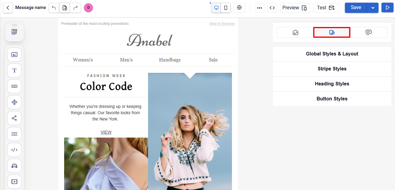 Email design defines fonts, colors, backgrounds, paddings, as well as the appearance of buttons and headings. These settings apply to the entire message, allowing you to quickly create a consistent design without editing individual elements.