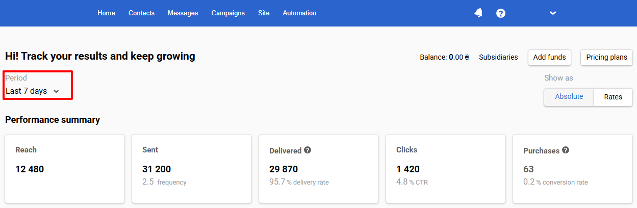 They display the overall results of triggered and bulk campaigns across all communication channels for the selected period and help quickly assess trends in contact engagement.