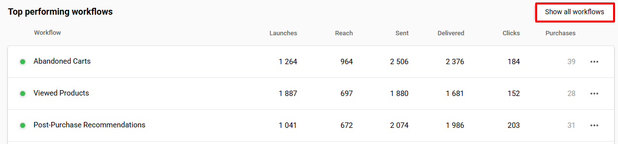 | Purchases | Total purchases per all messages | Purchases per channel | Purchases generated within each workflow | Purchases generated per broadcast |