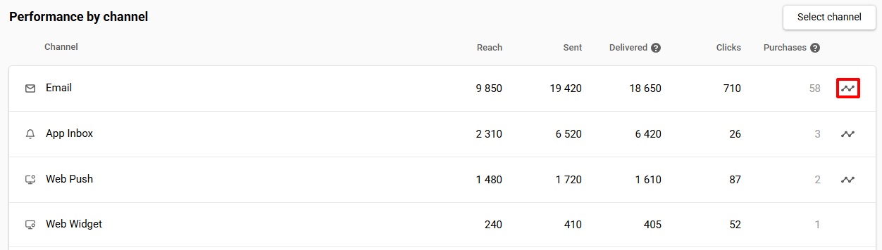 - Select channel: Choose the communication channel (e.g., Email, SMS, In-App) for which you want to view performance metrics.