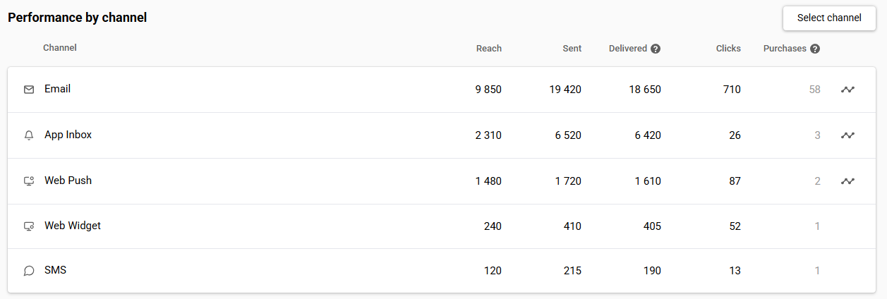- Analyze the performance of individual channels by comparing reach, sends, deliveries, clicks, and purchases.