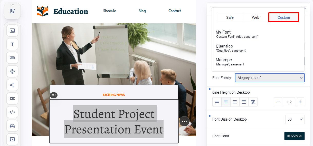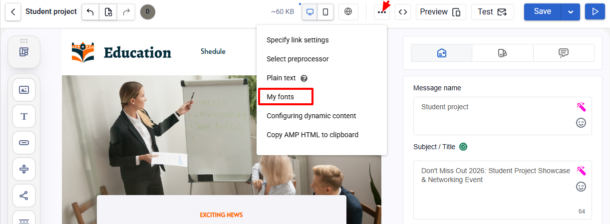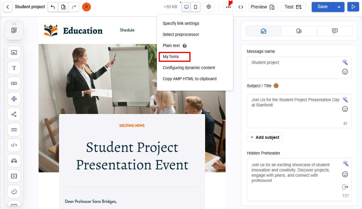 Custom fonts let you create a unique style for your emails. You can add fonts from Google Fonts or upload your own and use them in the email editor .