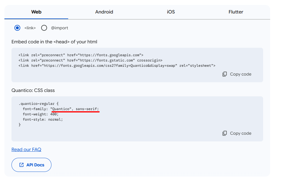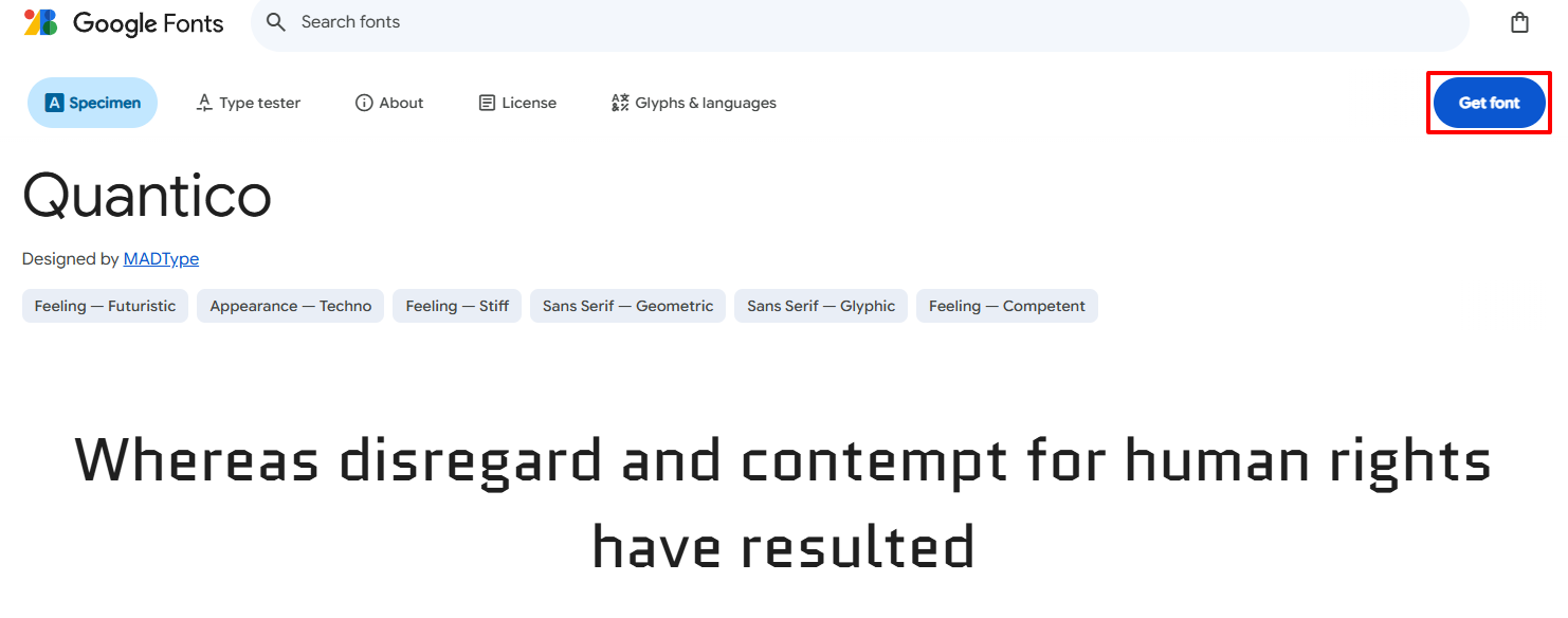 - In the Google Fonts tab, in the Quantico: CSS class section, copy the font family value in the following format: