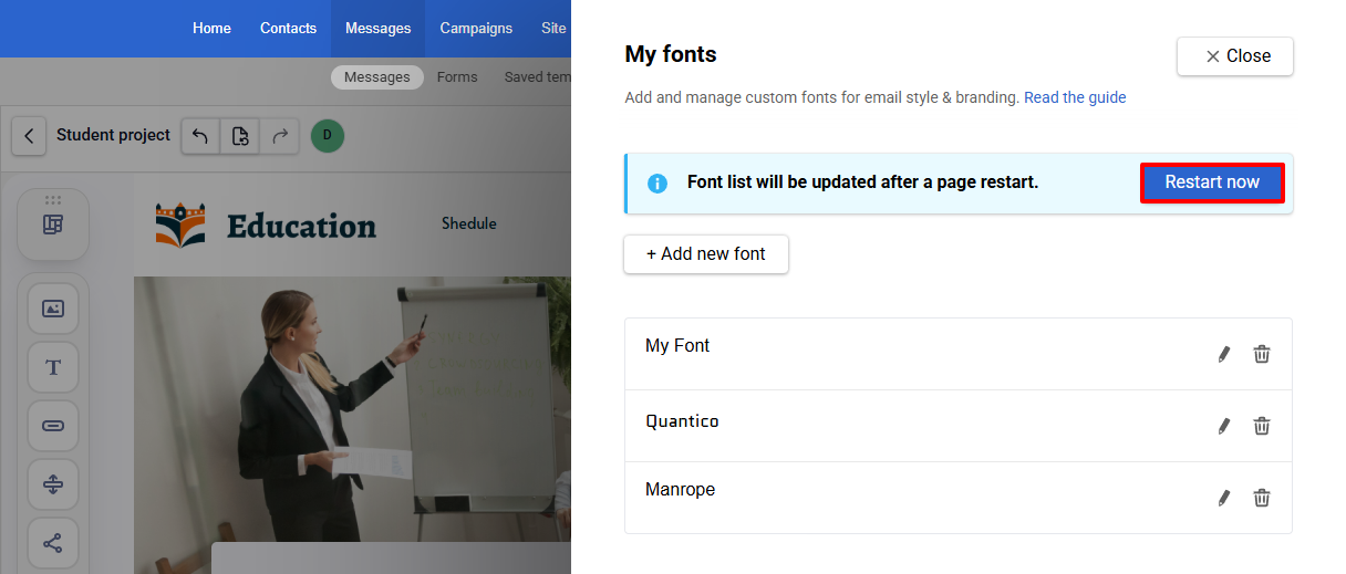 After the restart, the font appears in the list. If you have unsaved changes, you can postpone the restart. Save the email and reopen it to make the font available.