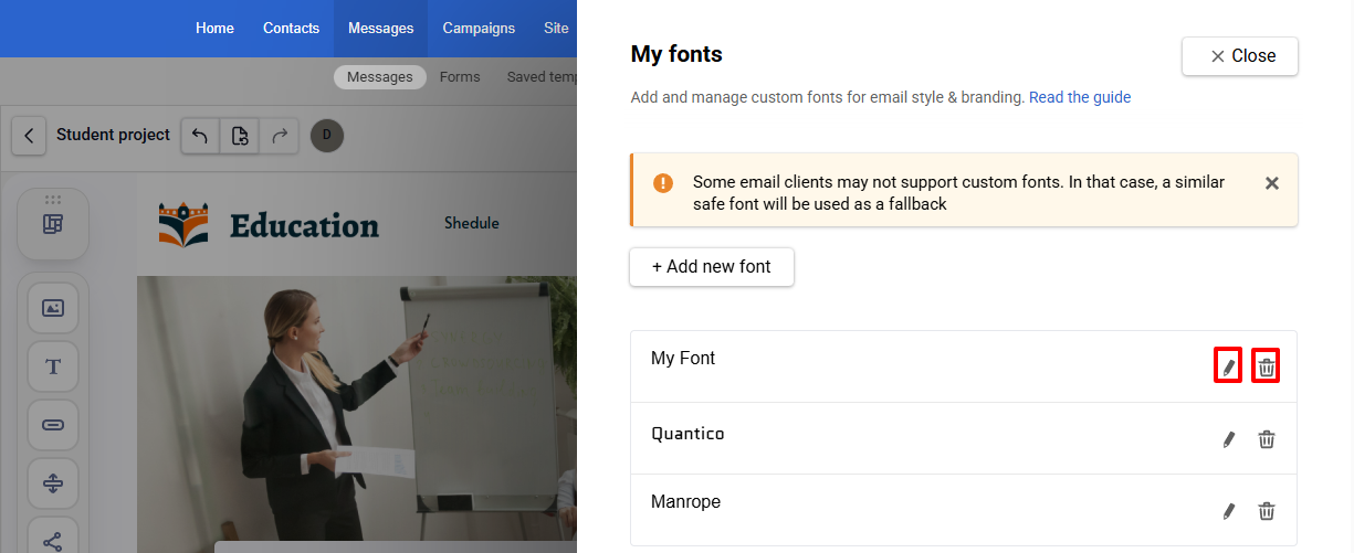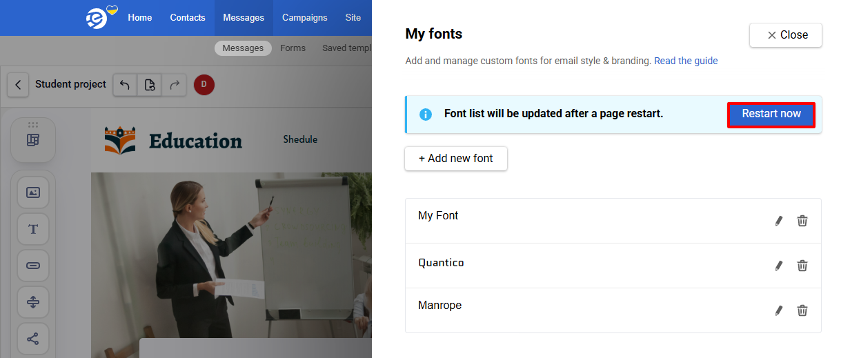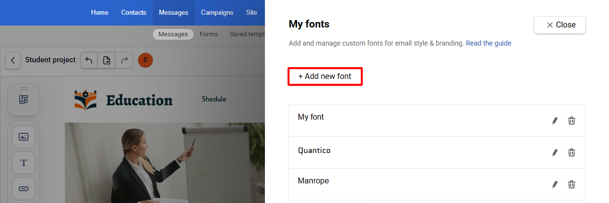 - In eSputnik tab, go to My fonts, and click Add new font.