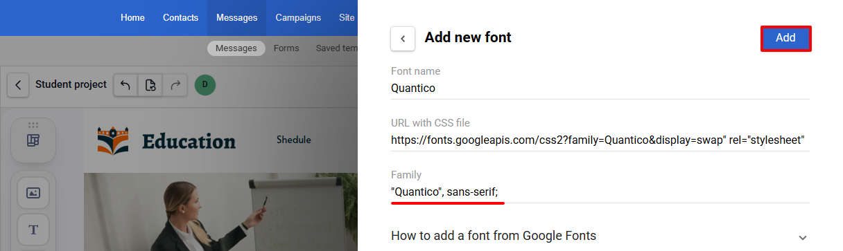 - Paste the Font name, URL with CSS file, and Family in the fields and click Add.