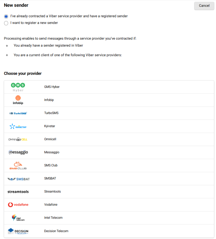 ImportantTo add a sender, you need to be a current customer of one of the following Viber service providers: