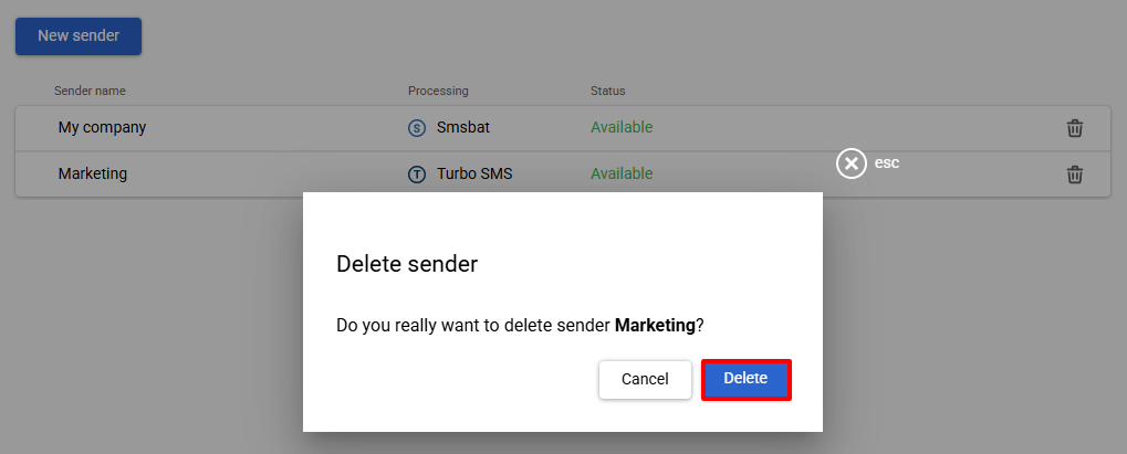 ImportantBefore deleting a sender, you need to create or select another one, otherwise, you will be unable to send messages.