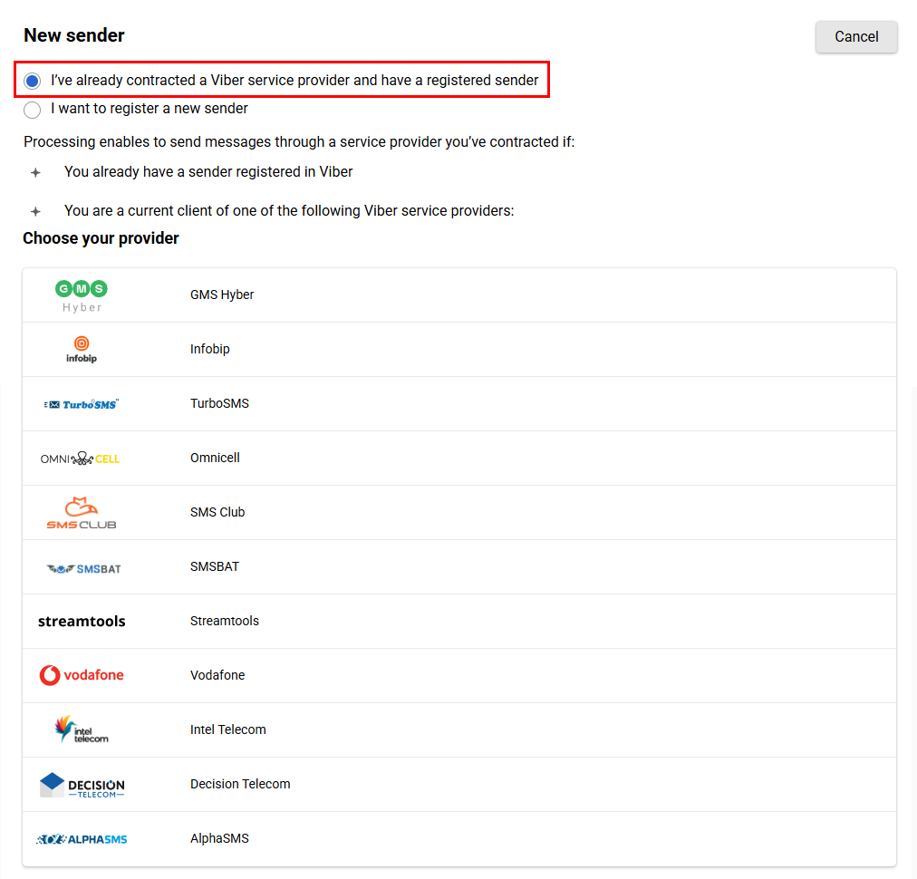 - Select the I’ve already contracted a Viber service provider and have a registered sender option and specify the provider you work with.