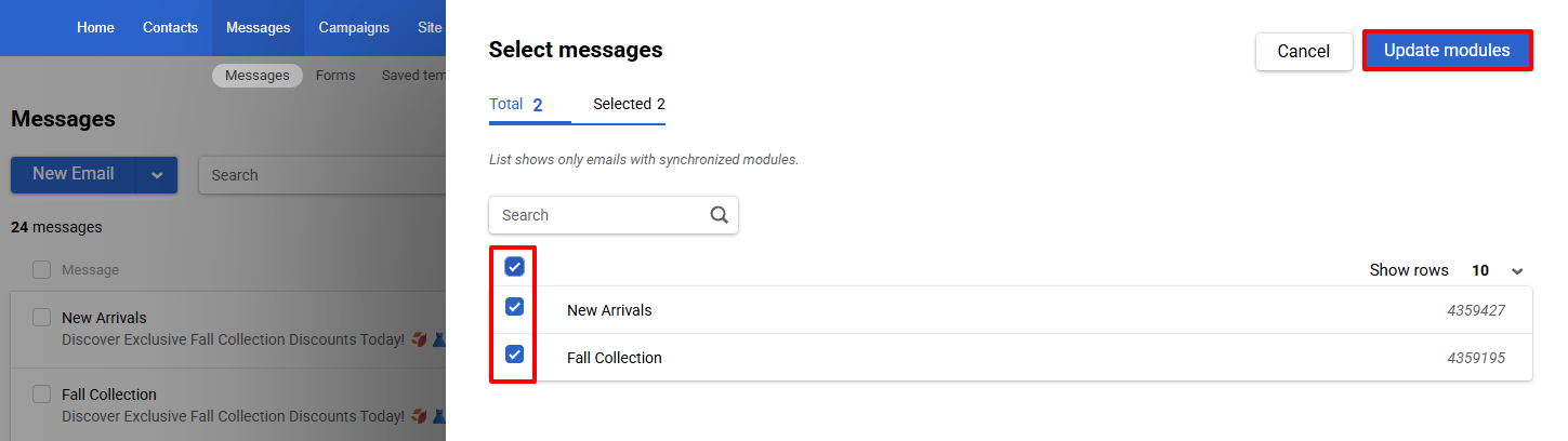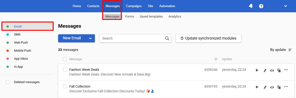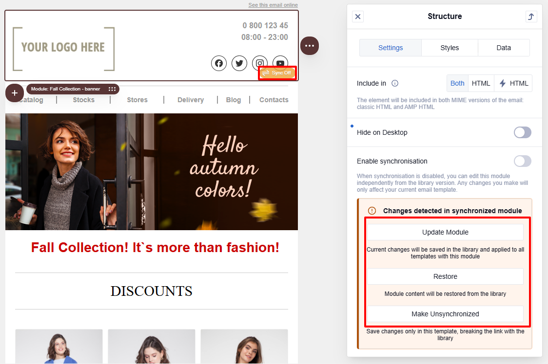 A synchronized module is an email element that can update automatically across all templates where you use it. This helps you avoid editing each email manually and works especially well for triggered campaigns.