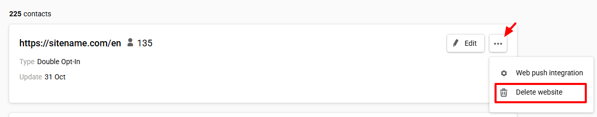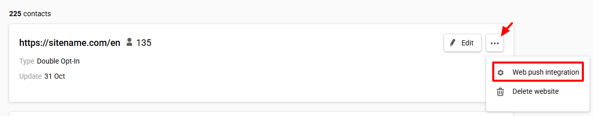 To return to the integration settings, for example, to change the website name, re-upload the installation file, or copy the generated code, click the website link or the three dots icon and select Web Push integration.